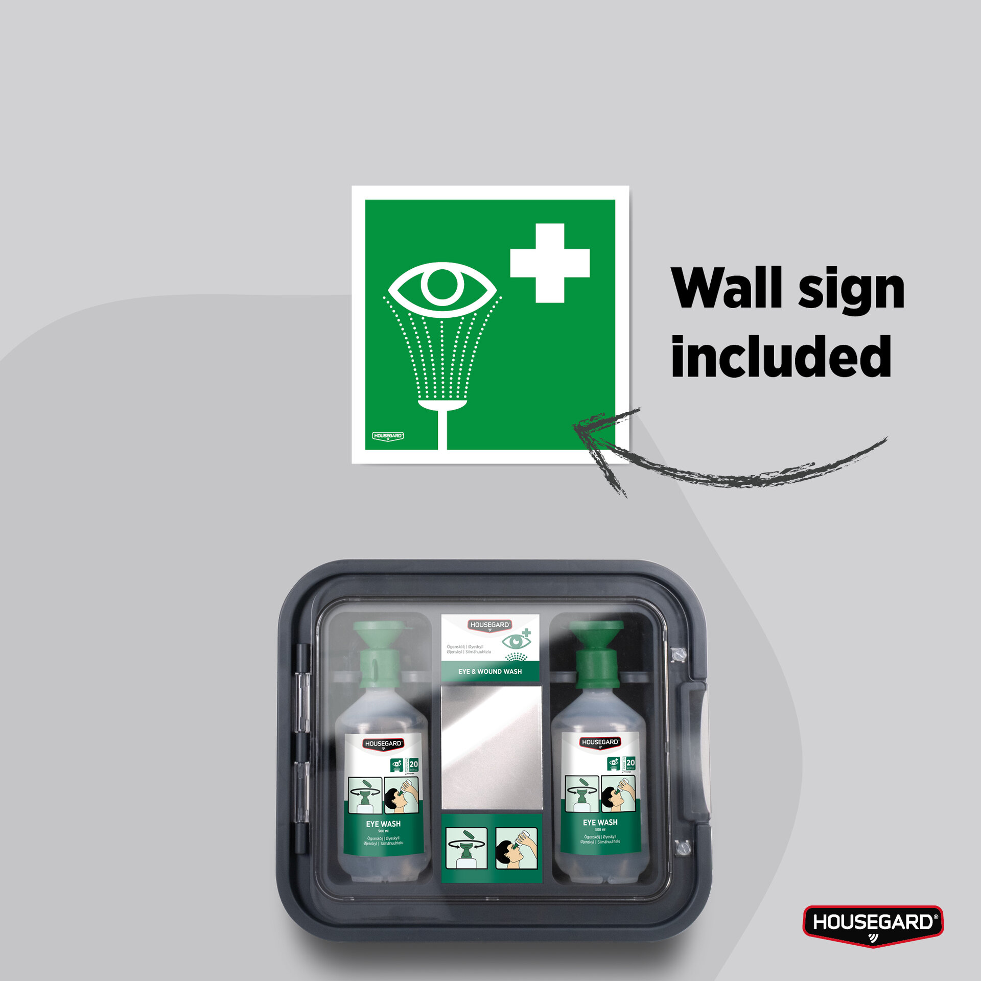 Flaskerne opbevares bag en transparent låge, som beskytter mod snavs og samtidig holder indholdet synligt og let tilgængeligt. Spejlet i stationen gør det lettere at rette skylningen korrekt, også hvis du selv skal skylle øjet.