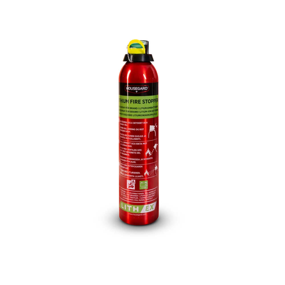 Lith-EX on kehitetty litiumioniakkujen aiheuttamille paloille kodeissa, joissa elektronisia laitteita ladataan. Se sijoitetaan latauspaikkojen läheisyyteen, jotta se on helposti saatavilla alkavan palon varalta. Seinäteline sisältyy.