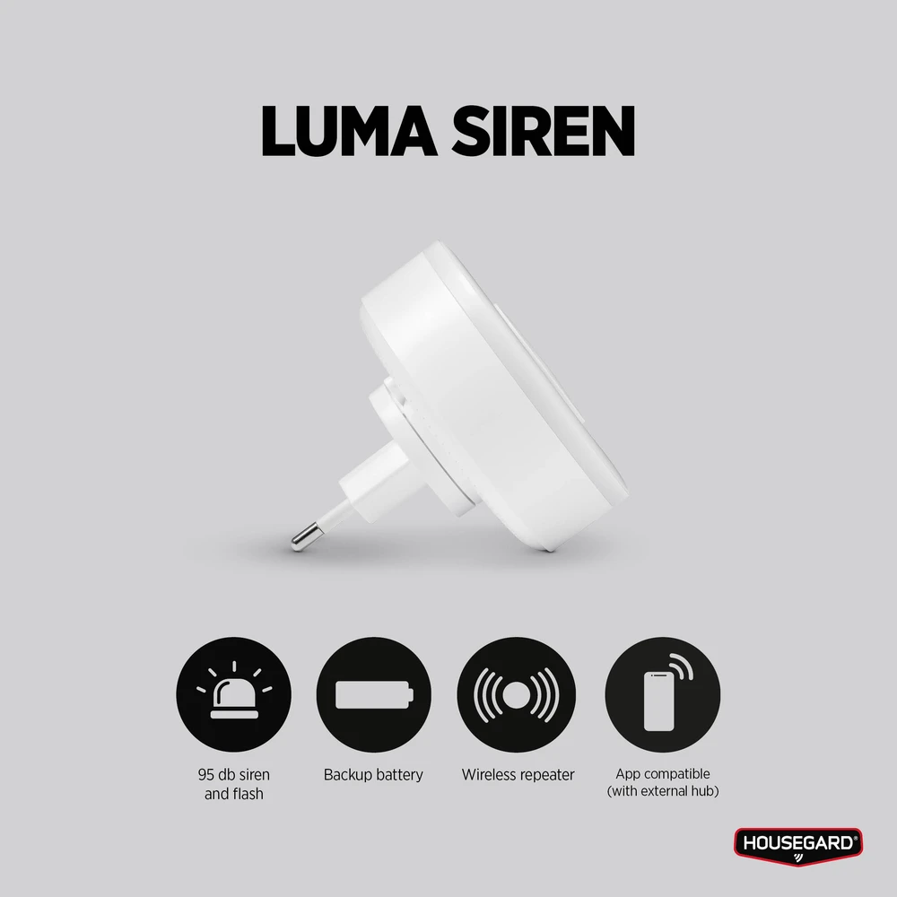 Luma langaton sireeni tarjoaa maksimaalisen suojan voimakkaalla 95 dB äänellä ja vilkkuvalla valolla – täydellinen kuulo- tai näkövammaisille. Sireeni kytketään helposti tavalliseen 230 V pistorasiaan, ja siinä on neljän tunnin akkuvarmennus sähkökatkon varalle. Se voidaan langattomasti yhdistää jopa 40 laitteeseen 868 MHz taajuudella ja toimii sekä Luma Hubin kanssa että ilman. Luma Hubin avulla saat ilmoitukset suoraan puhelimeesi Smart Life -sovelluksen kautta ja voit hallita turvallisuusjärjestelmääsi helposti. Nopean asennuksen ansiosta lisäät kodin turvallisuutta vaivattomasti.