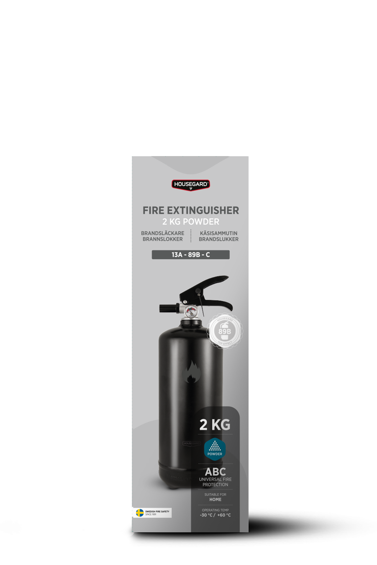 Den svarta 2 kg pulversläckaren från Housegard Design kombinerar funktion och estetik. Med sin moderna svarta yta blir den en snygg detalj i hemmet samtidigt som den är lättillgänglig när du behöver den.