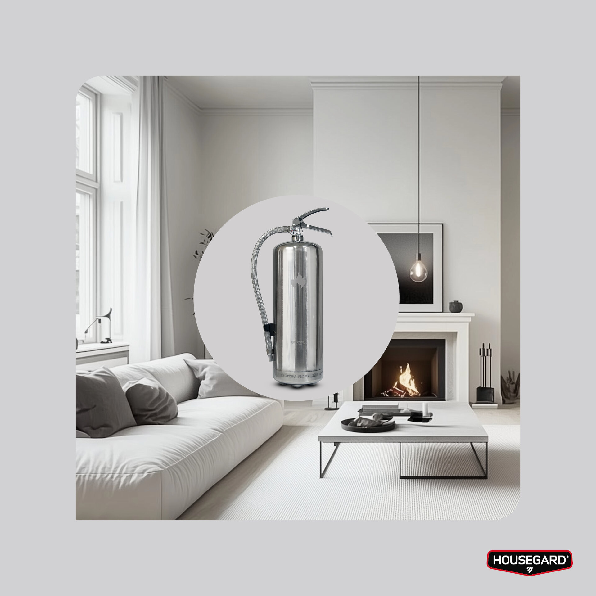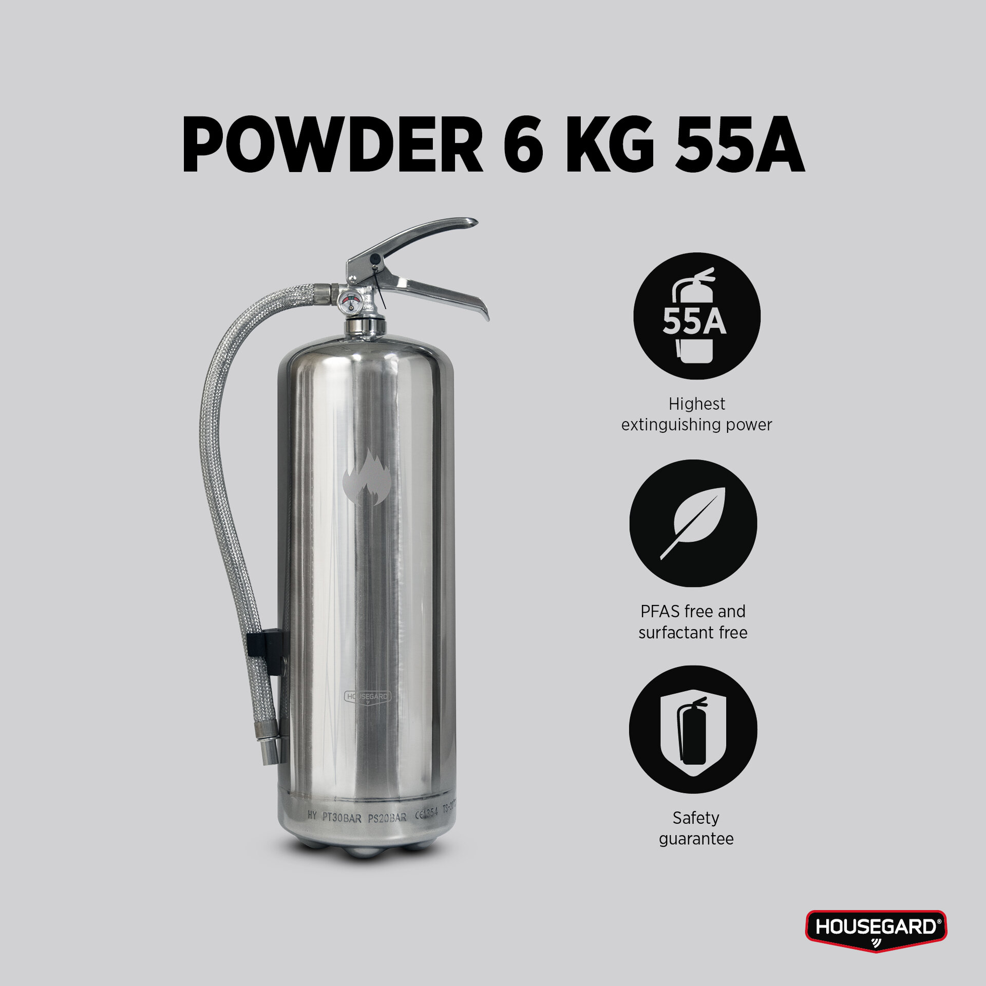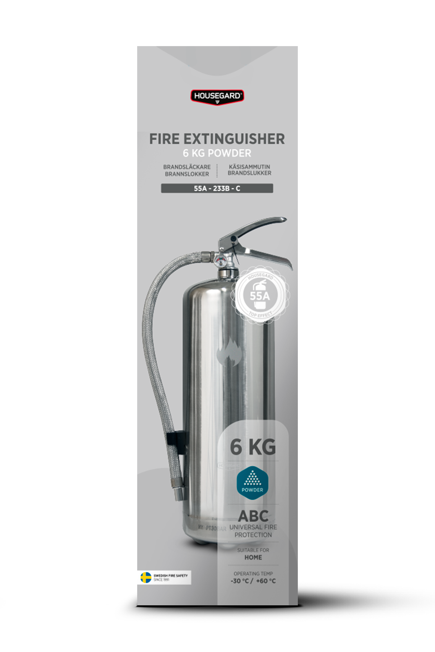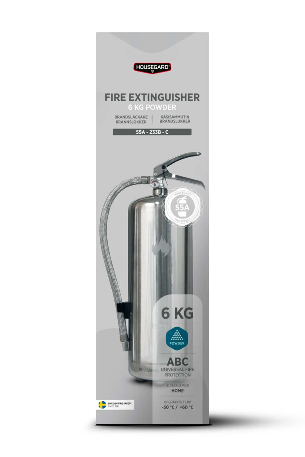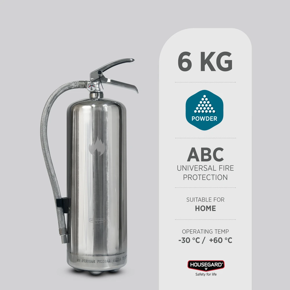 Design by Housegard-serien är avsedda för hemmamiljöer där användaren förväntas ha koll på var släckaren är placerad ifall olyckan är framme. Housegard 6 KG pulverbrandsläckare har effektivitetsklassen 55A 233B C, den högsta släckeffekten på marknaden.
