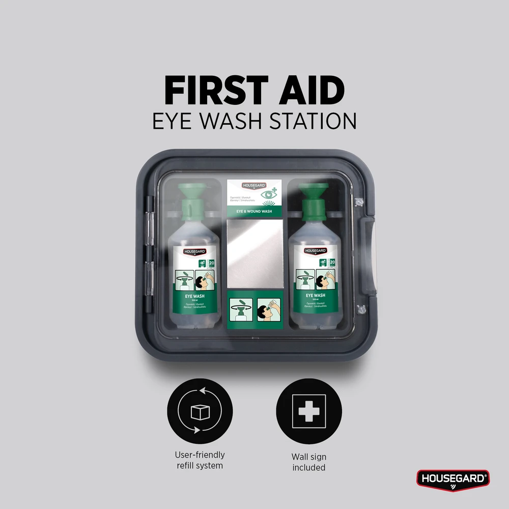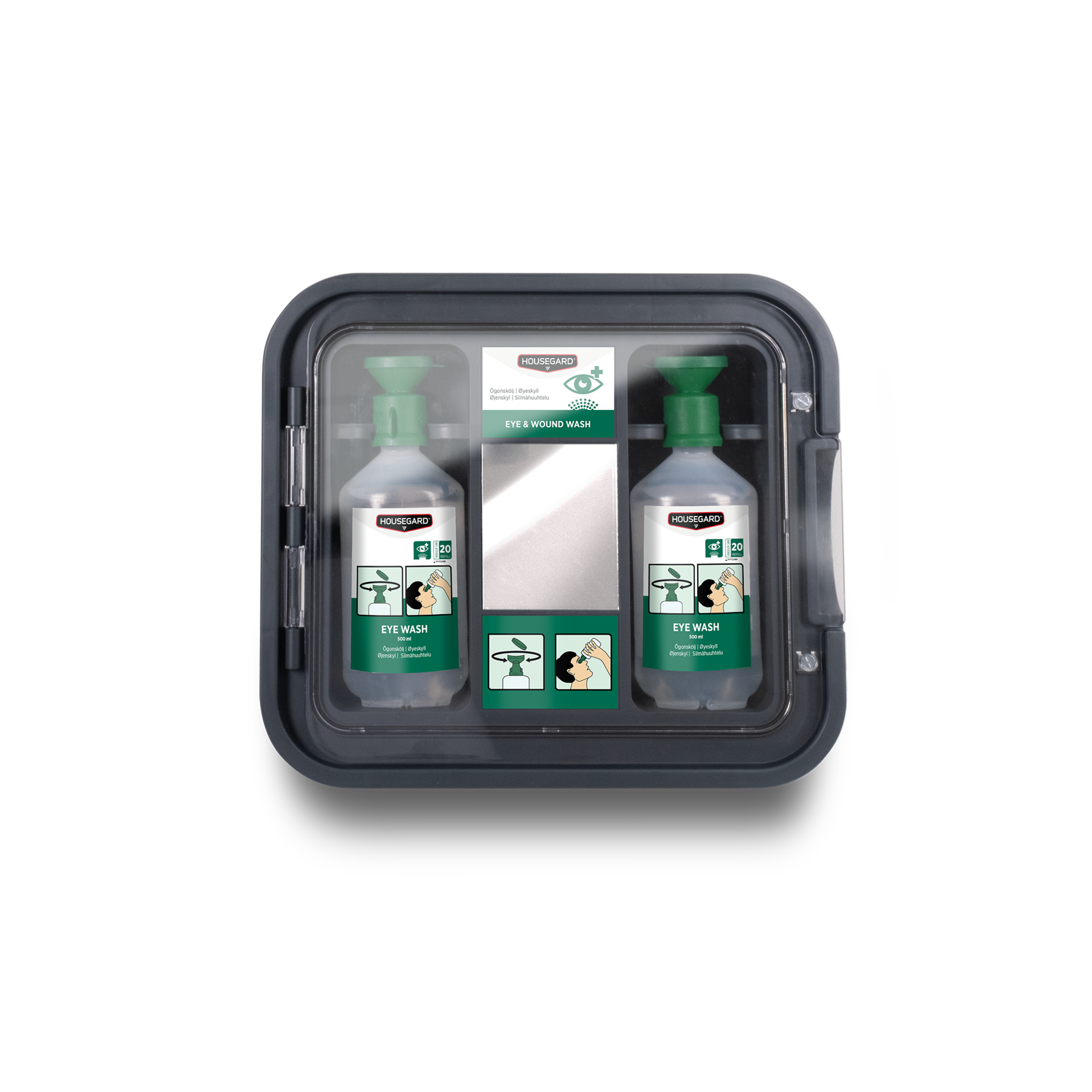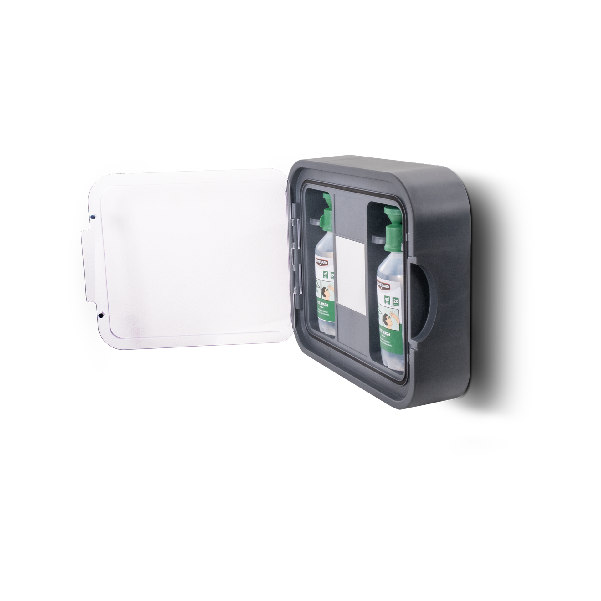 Ett lättplacerat ögonsköljskåp som gör det möjligt att skölja ögonen direkt om damm eller smuts råkar hamna i dem. Skåpet har transparent lucka så att flaskorna alltid syns och är enkla att nå, samt spegel som hjälper dig att rikta sköljningen rätt. Det innehåller två flaskor med steril 0,9 % NaCl-lösning och levereras med skylt för tydlig placering. En trygg lösning att ha i hobbyrum, verkstad, garage eller föreningslokal där partiklar kan förekomma och en snabb åtgärd behövs.
