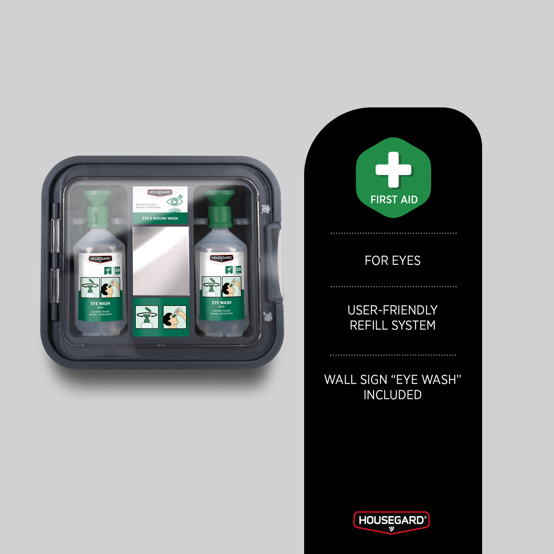 Skåpet innehåller två flaskor med steril 0,9 % natriumkloridlösning (NaCl). Den är avsedd att skölja ögat noggrant och få bort partiklar och irritanter så snabbt som möjligt.