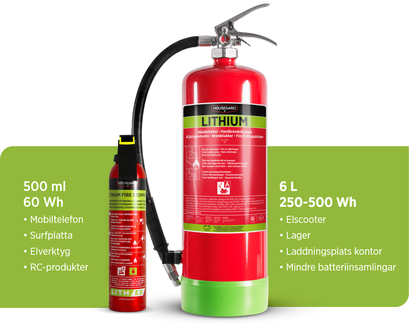 Storlek: Housegard erbjuder både Lith-EX spray 500 ml för hemmet och AVD 6 L brandsläckare för större riskmiljöer.