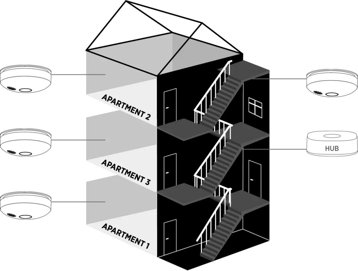 Systemet går att använda även i flerfamiljshus och bostadsrättsföreningar. Genom att koppla brandvarnarna till en hub kan man enkelt skapa en gemensam lösning där alla varnas vid ett larm.
