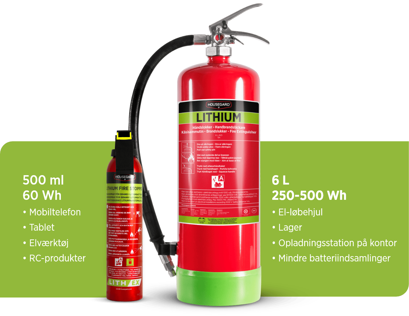 Størrelse: Housegard tilbyder både Lith-EX spray 500 ml til hjemmet og AVD 6 L brandslukkere til større risikomiljøer.