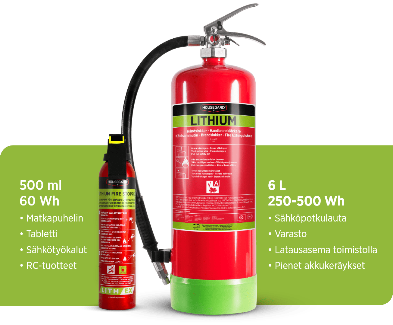Housegard tarjoaa Lith-EX-spraytä (500 ml) kotiin sekä 6 L AVD‑sammutinta alueille, joissa käsitellään suurempia tai vaarallisempia akkuja.