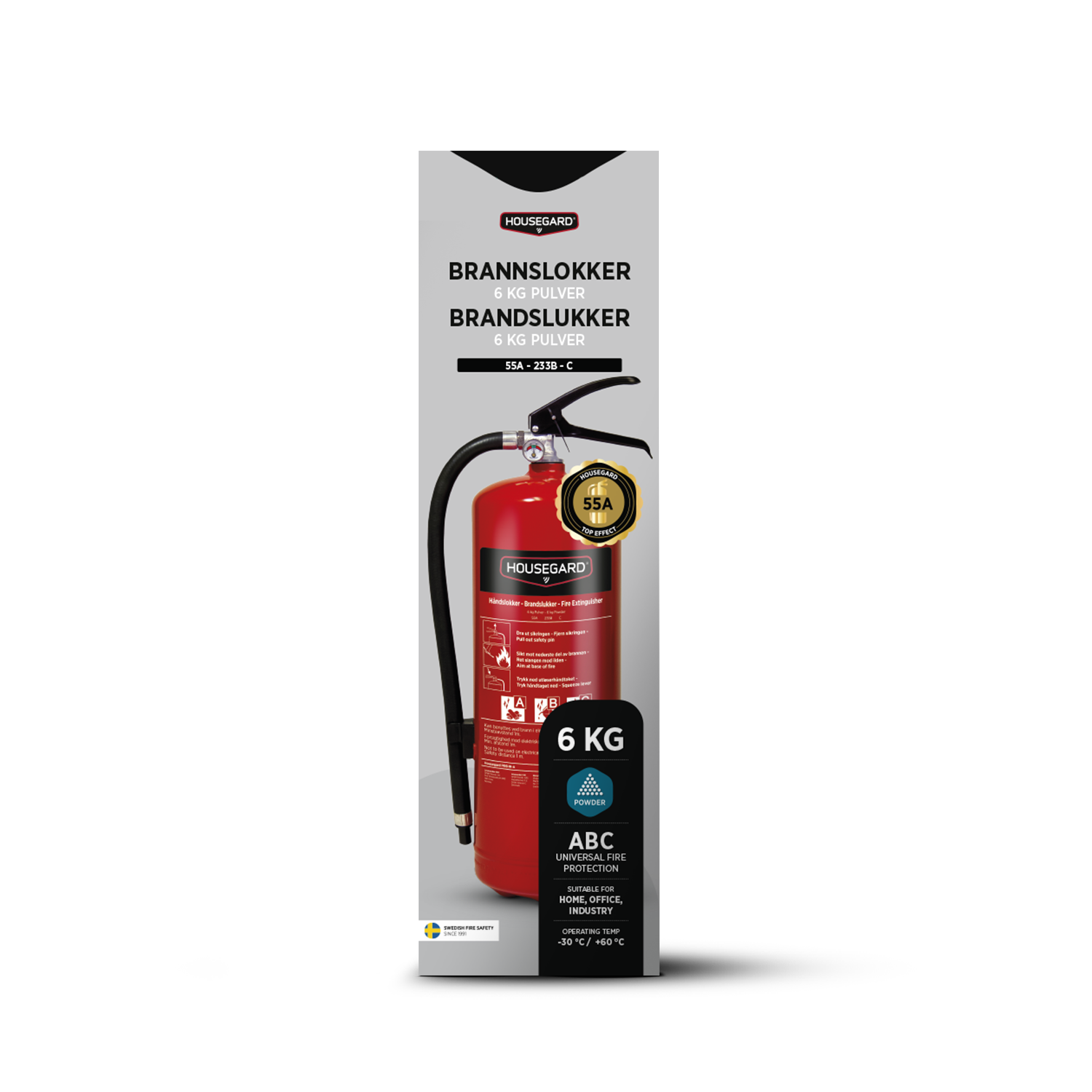 Teholuokitus kertoo, kuinka suuren palon sammutin pystyy sammuttamaan standardoiduissa testeissä. Luokitus 55A 233B C tarkoittaa erittäin korkeaa sammutuskykyä ja tekee tästä 6 kg:n jauhepalosammuttimesta tehokkaan vaihtoehdon kotiin ja yhteisiin tiloihin.