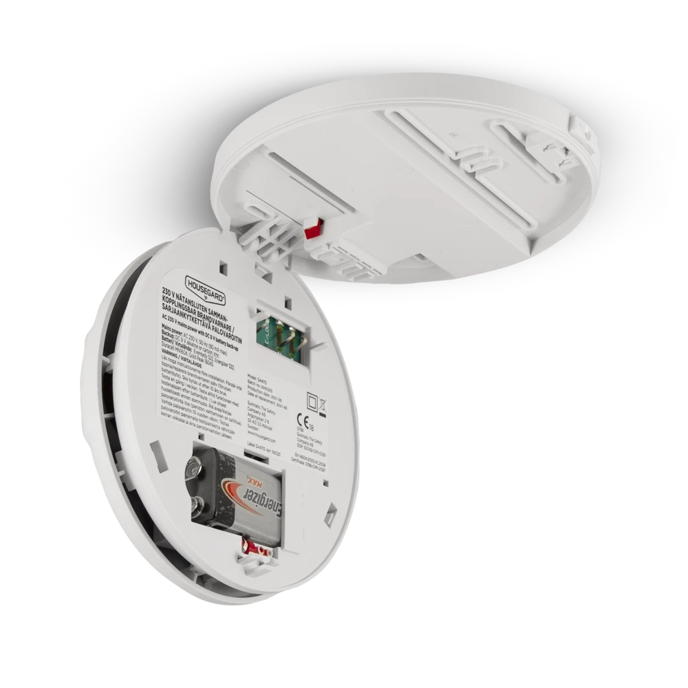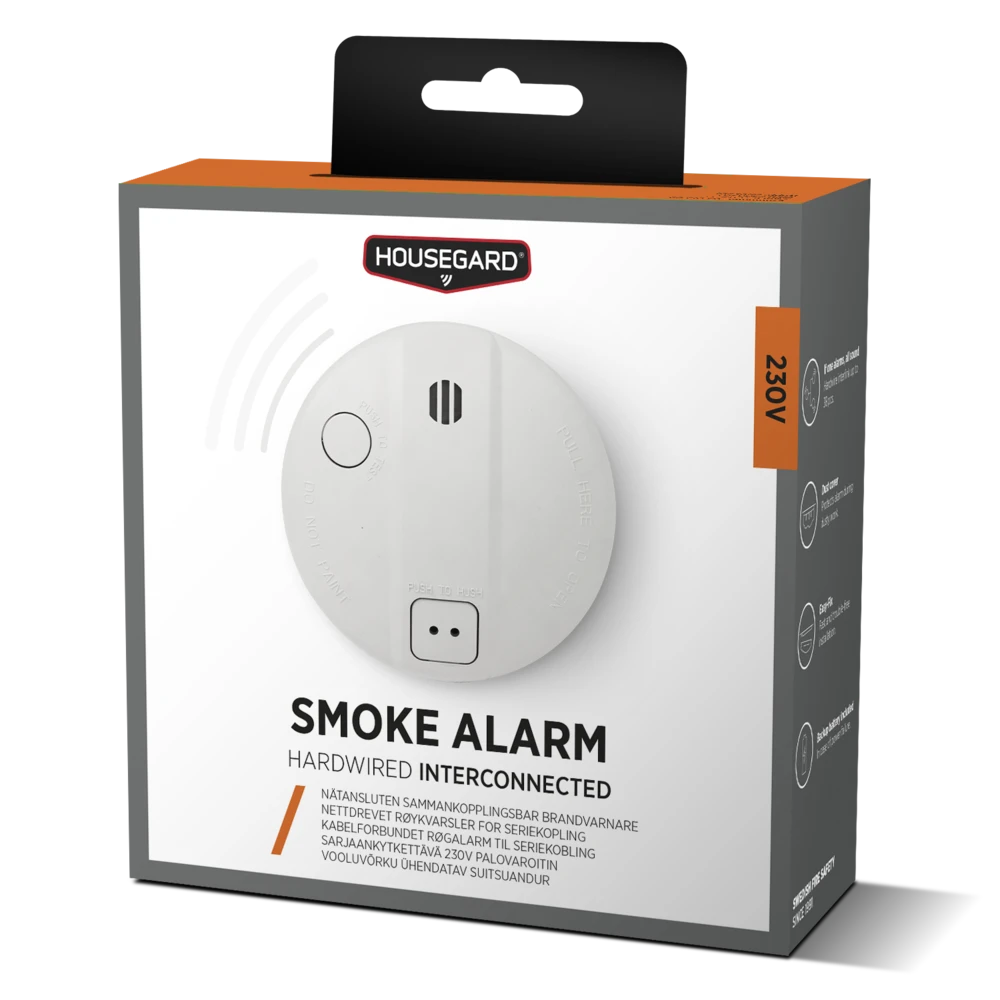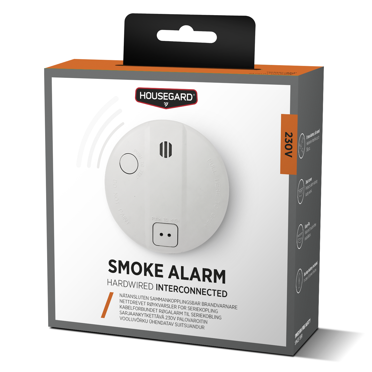 Housegard 230V-palovaroitin on optinen, sarjaliitettävä varoitin, joka kytketään suoraan sähköverkkoon. Sisäänrakennettu 9V varaparisto varmistaa toiminnan myös sähkökatkon aikana.