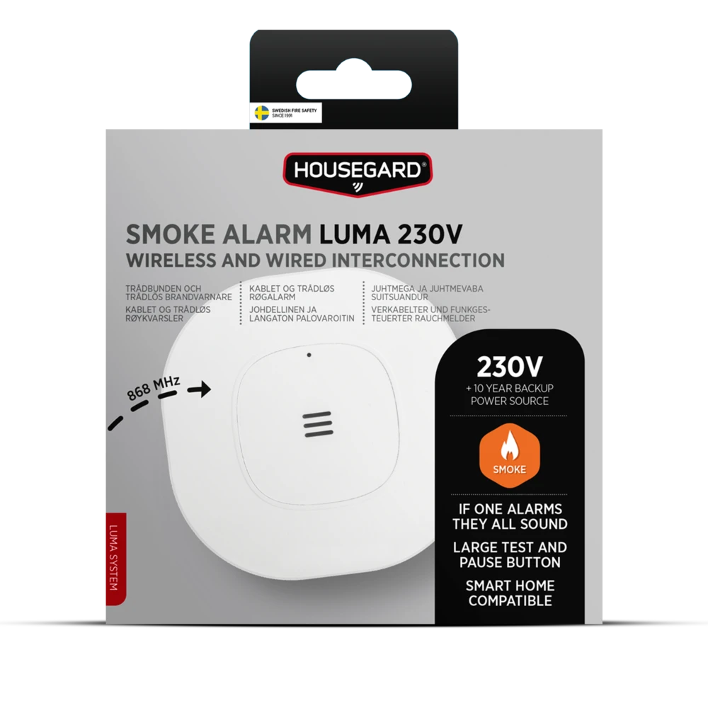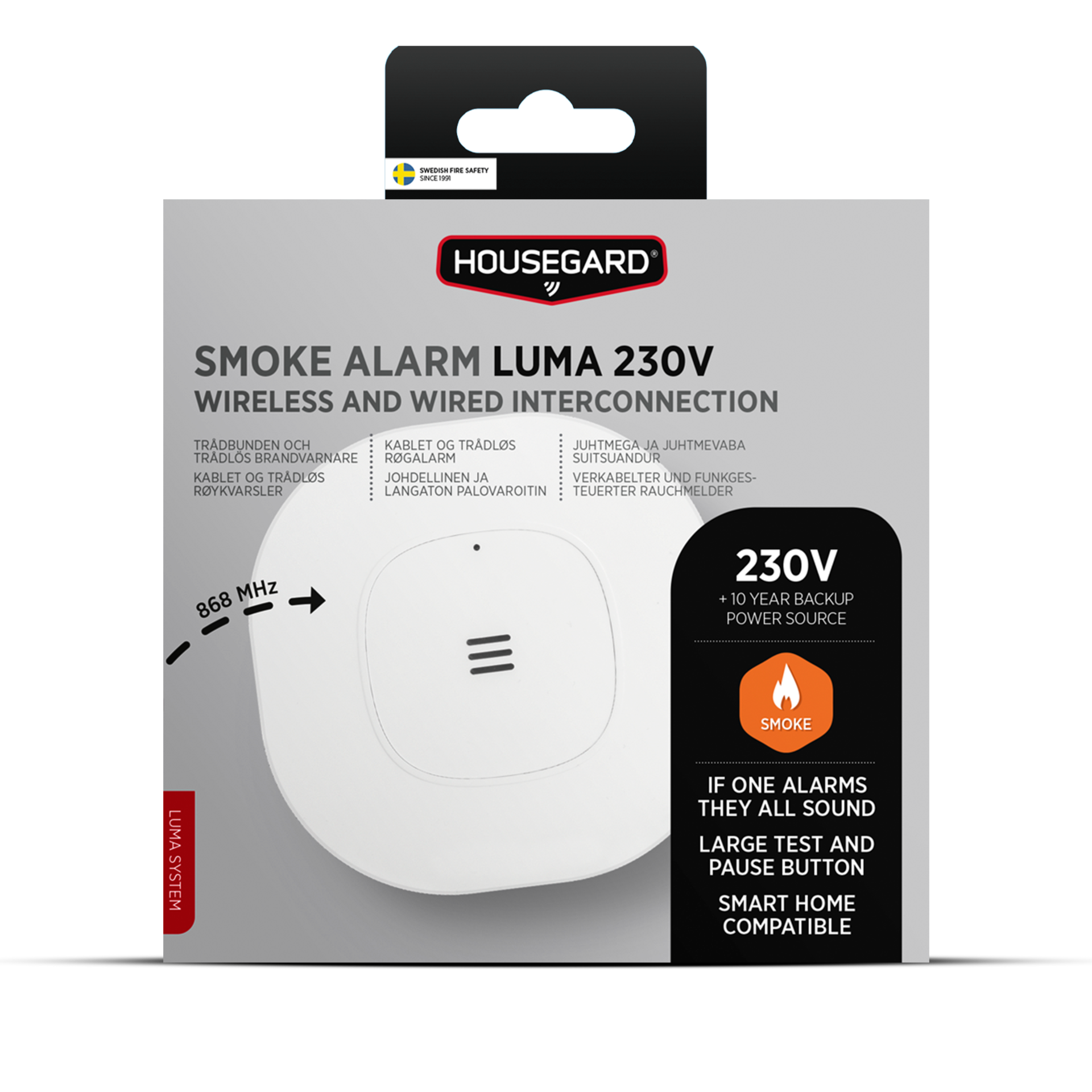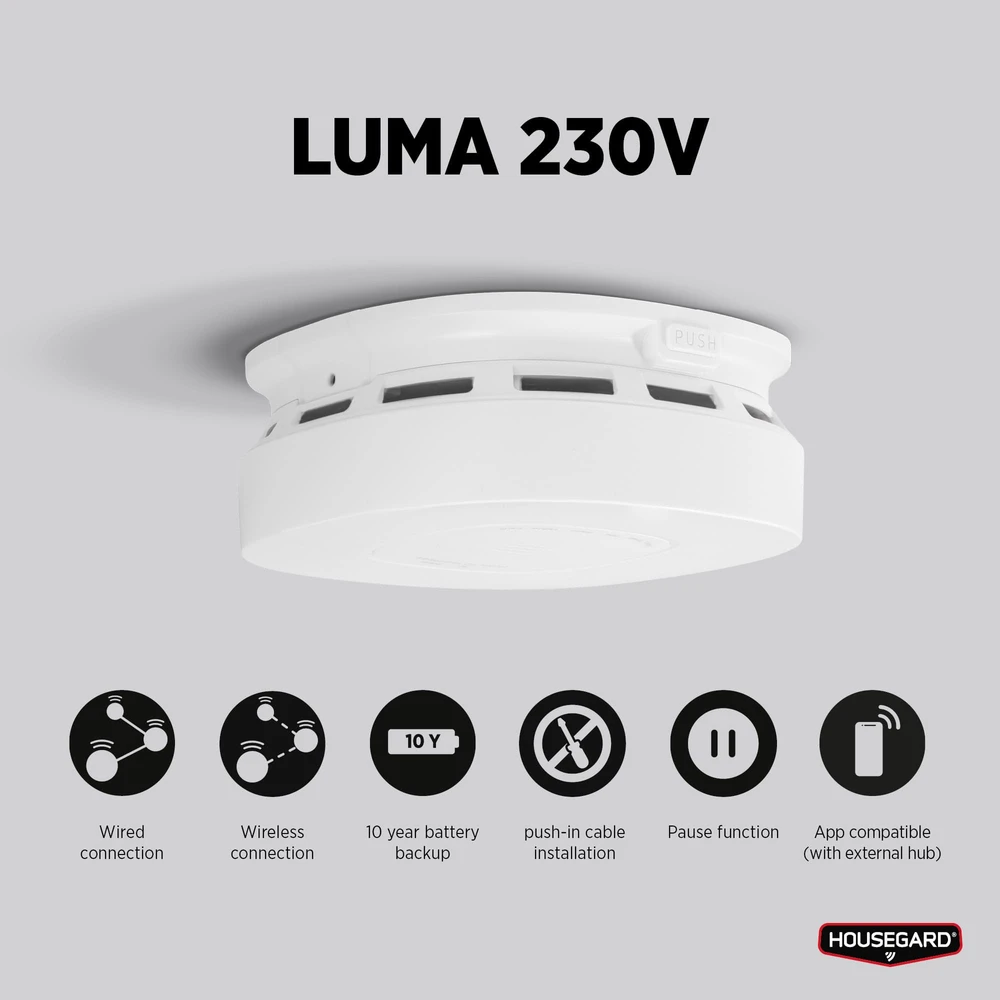 Luma 230V on luotettava palovaroitin koteihin ja rakennuksiin. Se liitetään kiinteästi sähköverkkoon ja sisältää 10 vuoden varapariston, joka pitää varoittimen toiminnassa myös sähkökatkon aikana. Asennuksen tekee sähköasentaja, ja varoitin voidaan yhdistää muihin Luma-laitteisiin kattavaa paloturvaa varten.