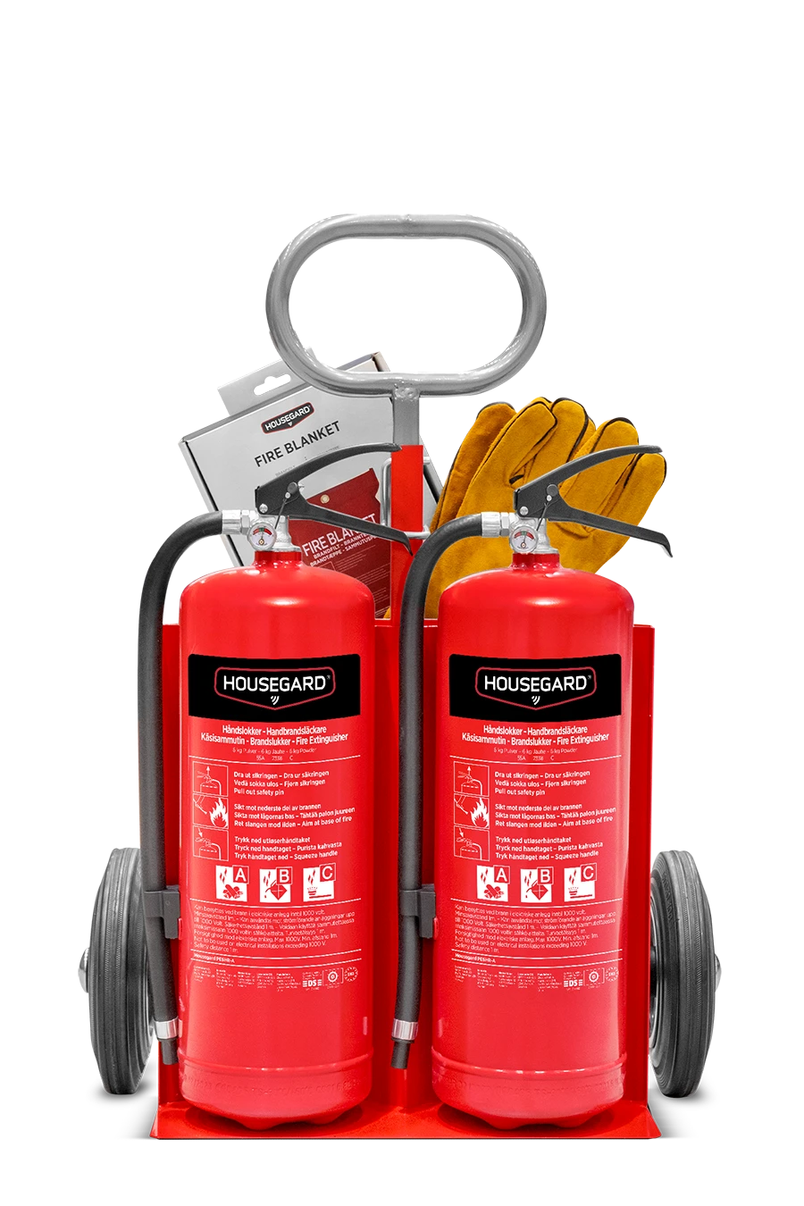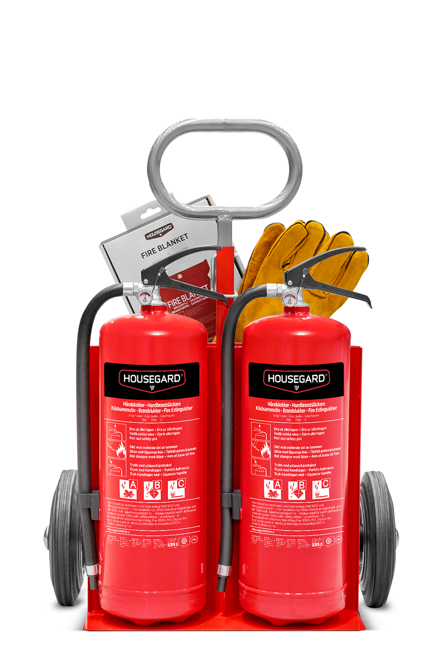 - Inneholder: 1 stk. tralle, 2 stk. Housegard pulverslukker 43A 233B C,1 stk. brannteppe 120 x 180 cm, 1 par sveisehansker