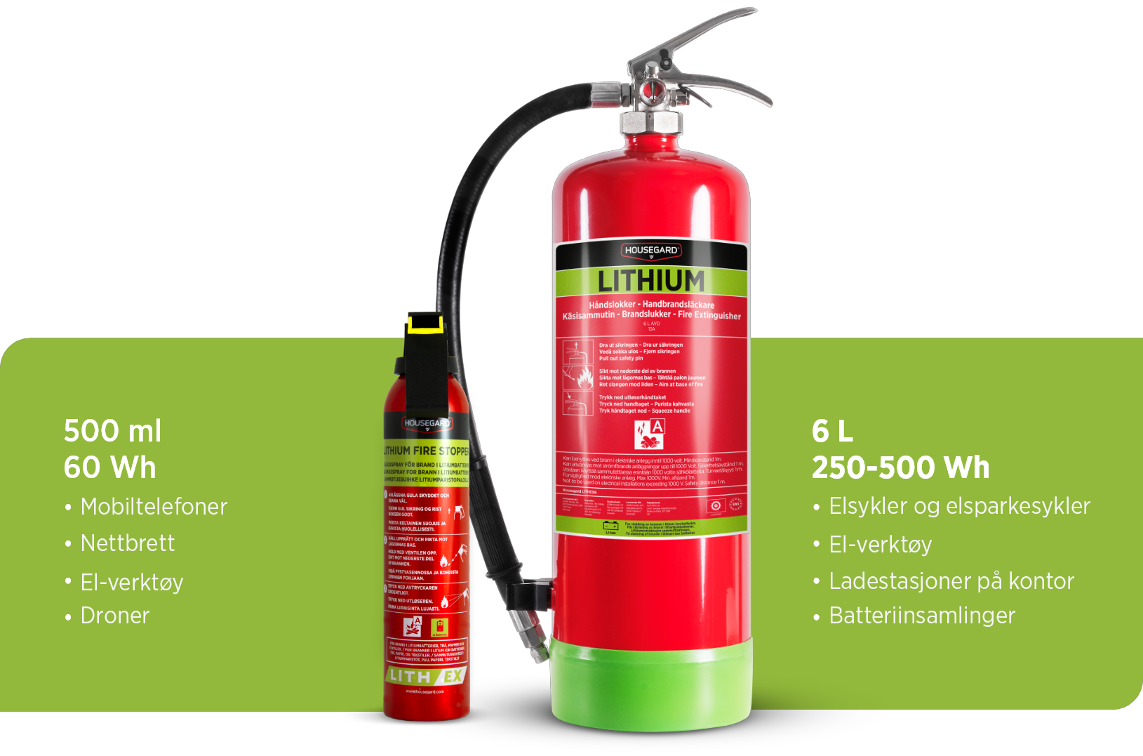Størrelse: Housegard tilbyr både Lith-EX spray 500 ml til hjemmebruk og AVD 6 L brannslukker for større risikomiljøer.