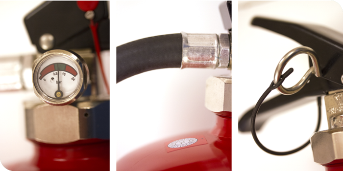 Kolla så att släckaren ser hel och ren ut. Inga stora bucklor, repor eller rost som kan göra att den läcker. Glöm inte att titta på slangen – den ska vara hel, sitta fast och vara fri från sprickor.