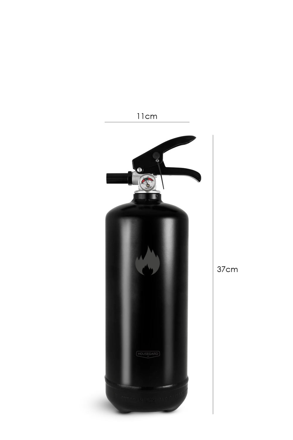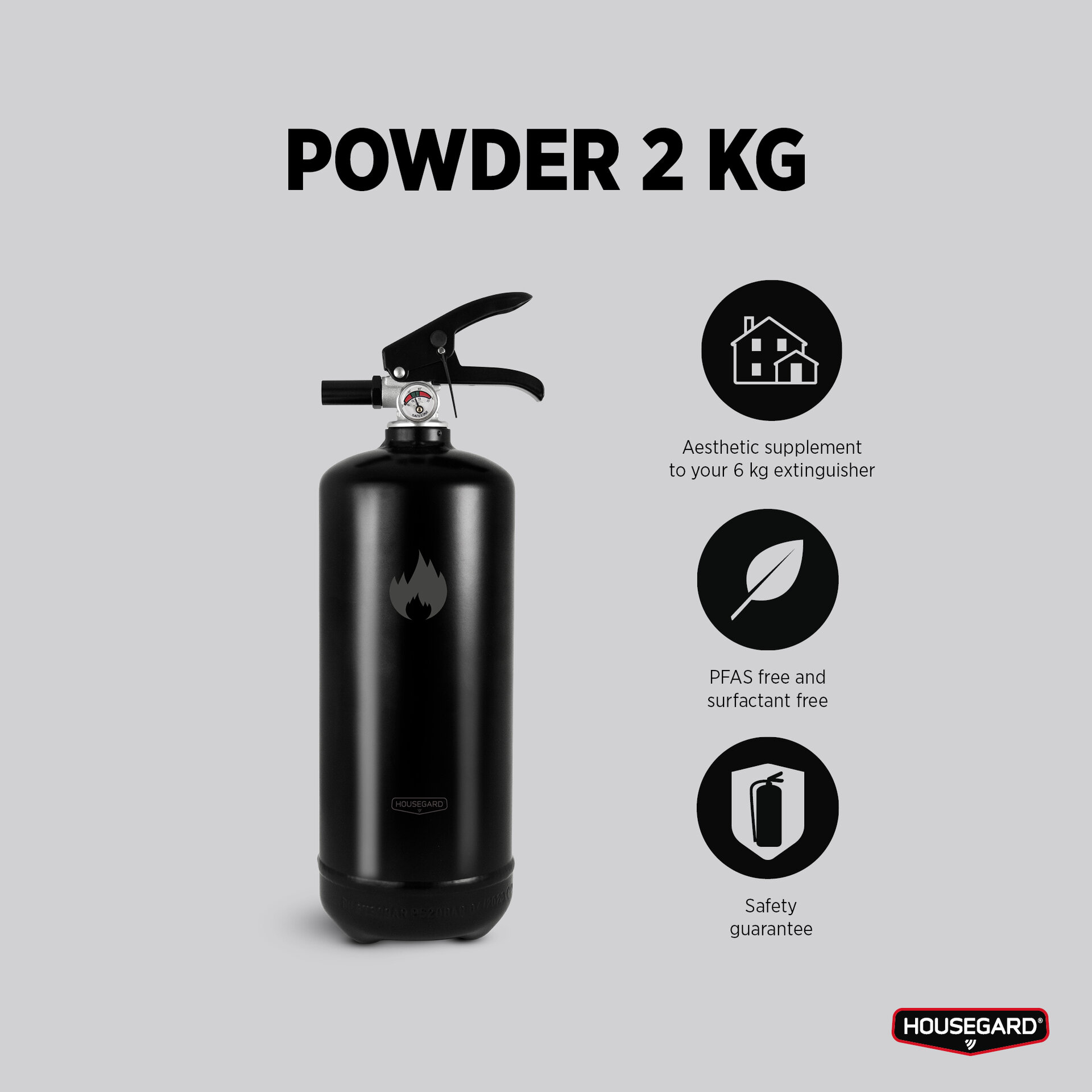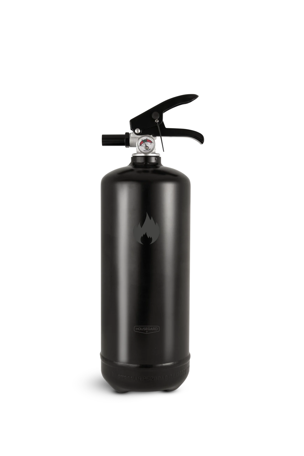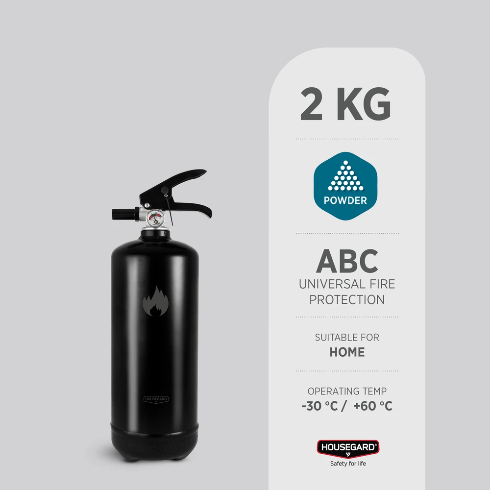 Den svarta 2 kg pulversläckaren från Housegard Design kombinerar funktion och estetik. Med sin moderna svarta yta blir den en snygg detalj i hemmet samtidigt som den är lättillgänglig när du behöver den.