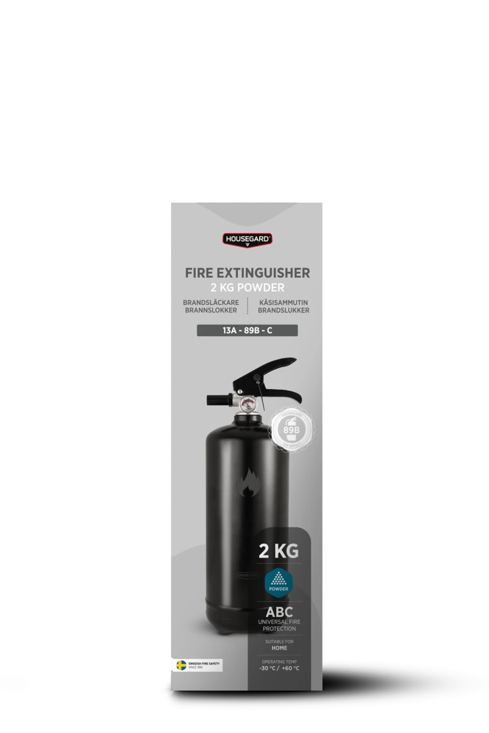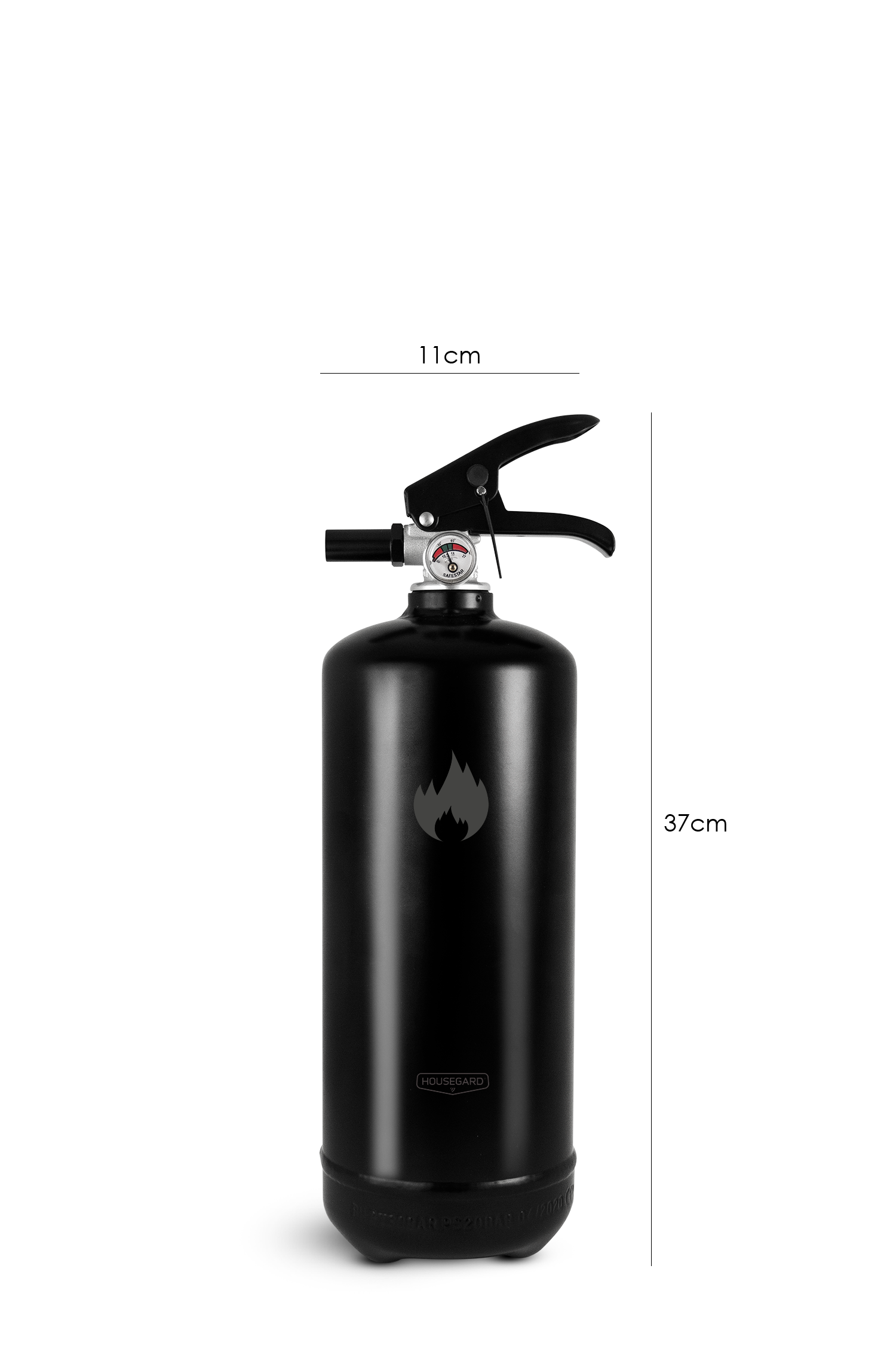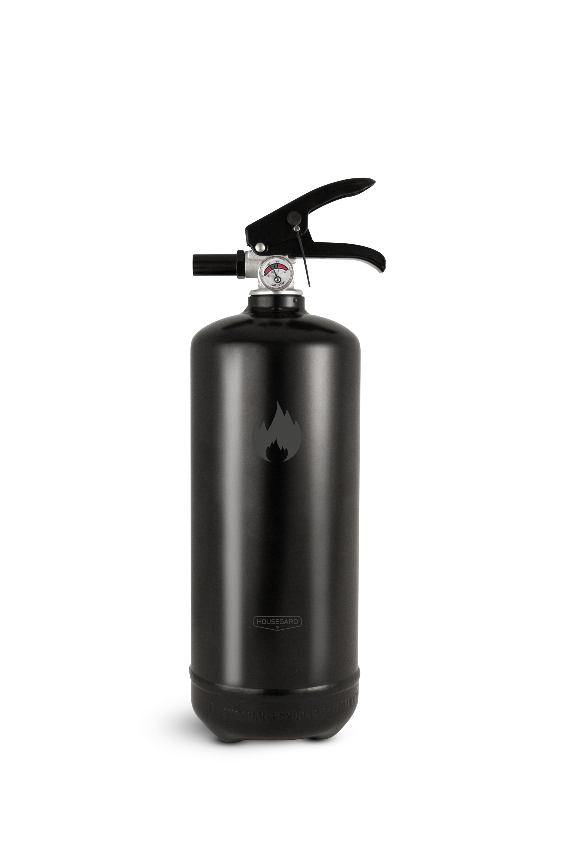 Den svarta 2 kg pulversläckaren från Housegard Design kombinerar funktion och estetik. Med sin moderna svarta yta blir den en snygg detalj i hemmet samtidigt som den är lättillgänglig när du behöver den.
