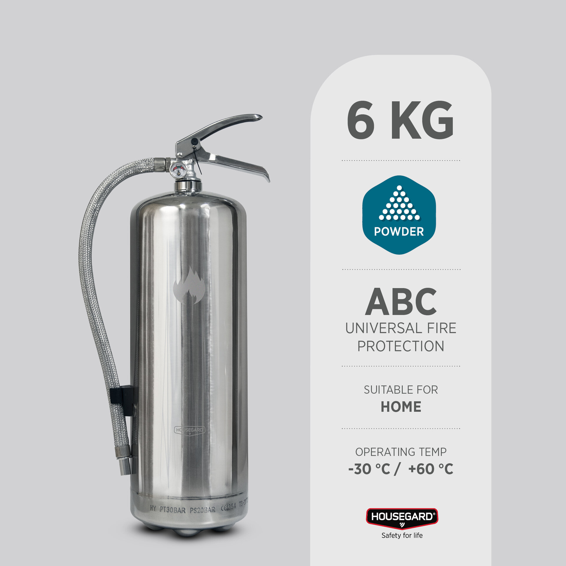 Pulversläckare på 6 kg är en vanlig storlek i hem eftersom den ger tillräcklig räckvidd och släckkapacitet för att hantera många typer av bränder som kan uppstå i bostaden. Design by Housegard-serien är framtagen för hemmiljöer där släckaren placeras synligt och där alla i hushållet vet var den finns. Den blanka stålfinishen gör att släckaren kan bli en naturlig del av inredningen samtidigt som den är lätt att hitta vid en nödsituation.