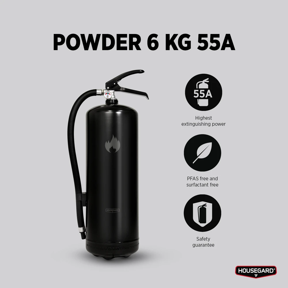 Housegard 55A 6 kg pulverbrandsläckare har effektivitetsklassen 55A, den högsta släckeffekten på marknaden.