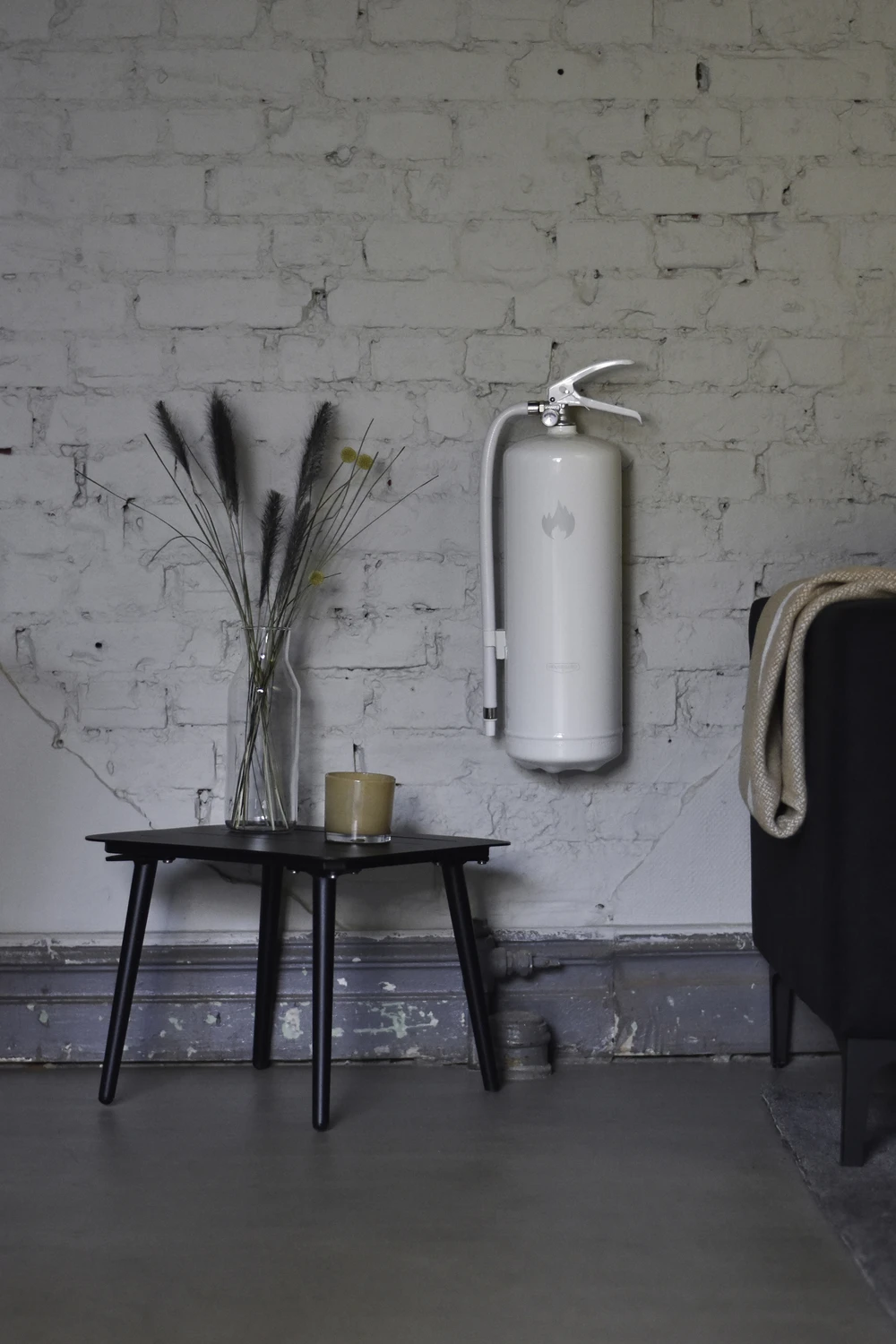 En vit brandsläckare som passar in i hemmets inredning. Denna är också en uppskattad inflyttningspresent. Väggfäste ingår.