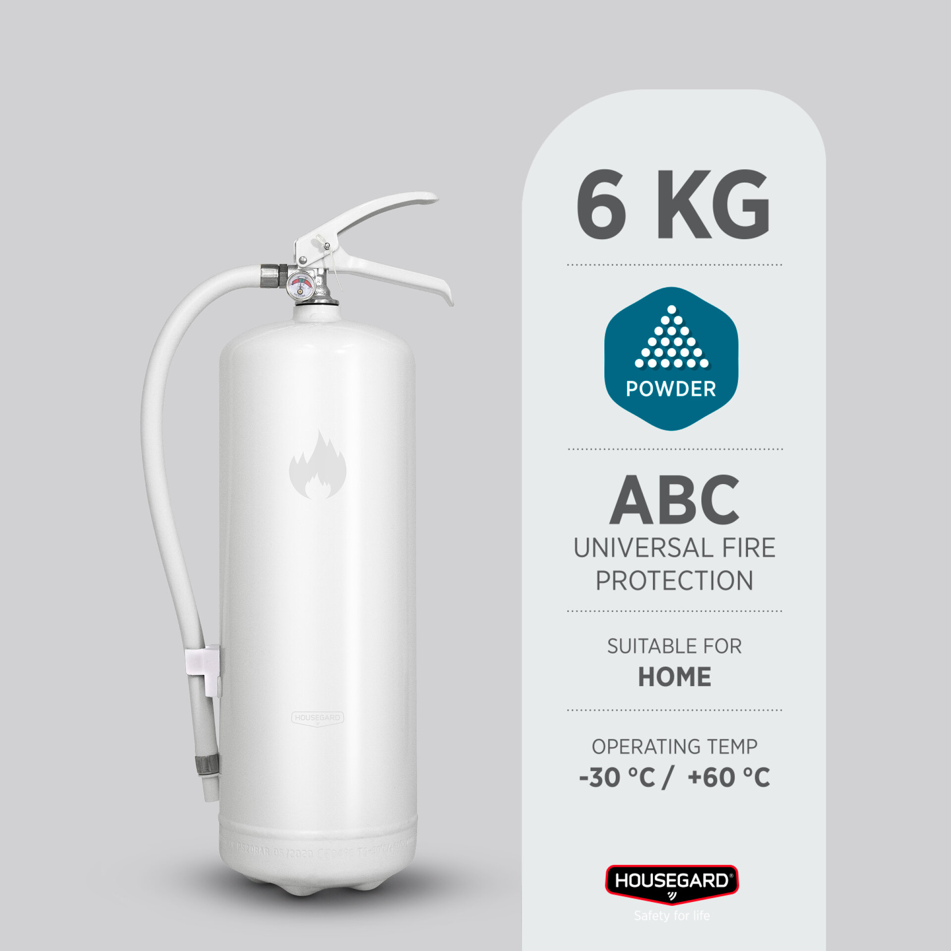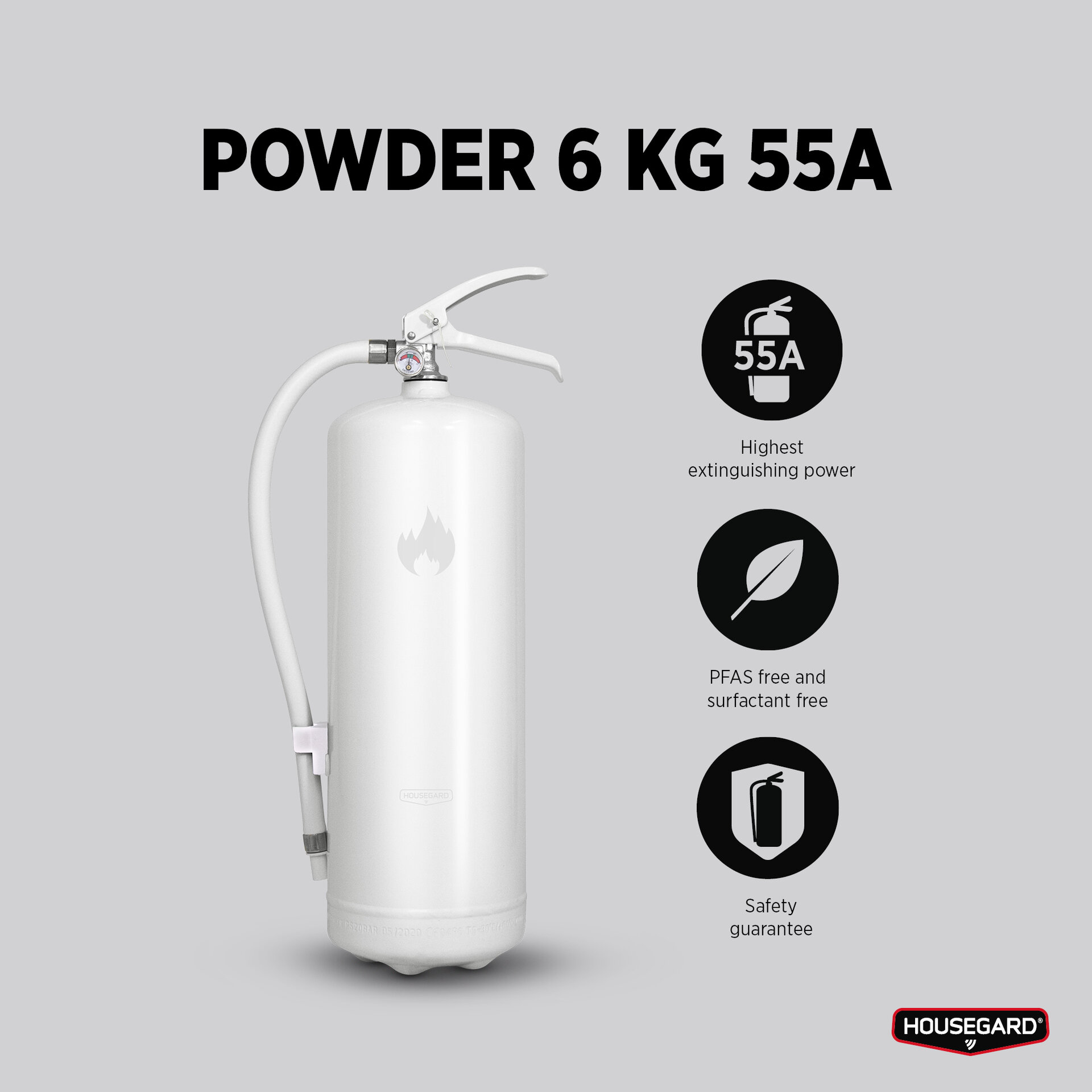 Housegard 55A 6 kg pulverbrandsläckare har effektivitetsklassen 55A, den högsta släckeffekten på marknaden.